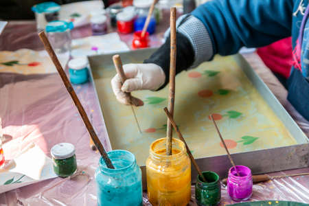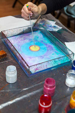 Process of creating ebru painting by colorful paints, paper and wooden stick. Bright abstract pattern in water.