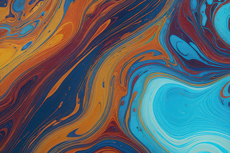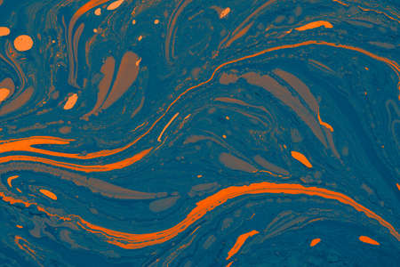 Marbled blue and orange abstract background. Liquid marble ink pattern.