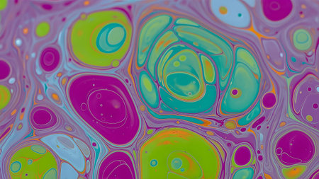 A mesmerizing macro view of fluid art, featuring vibrant magenta, lime, and teal orbs swirling in a lavender liquid base. The dynamic composition creates a psychedelic, cellular pattern.