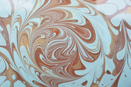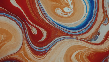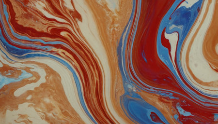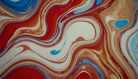 A detailed abstract showcasing the marbling technique with a rich combination of red, white, blue, and brown colors. The paints are mixed in a fluid manner, creating intricate, flowing patterns and organic curves that give the a sense of depth and movement. The surface is smooth and glossy, highlighting the vibrant colors and the unique textures formed by the swirling liquids. is a testament to the beauty of abstract liquid