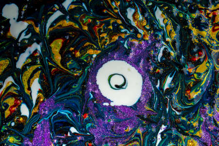 Multicolored acrylic background with dark streaks and white spots, sprinkled with glitter. Modern creativity. Colorful avant-garde eye pattern with rich texture. A background made up of many shapes and materials.