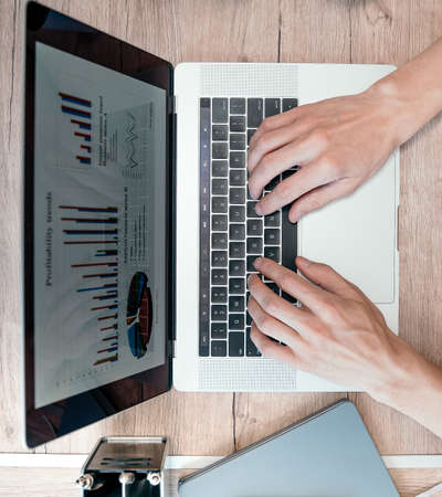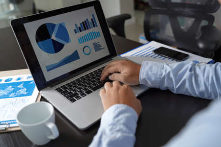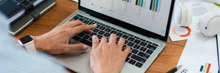 Close up hands of businesswoman working about financial and typing chart data on laptop keyboard.