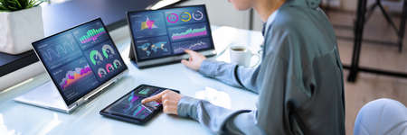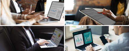 Collage of images of male and female businessmen viewing charts and statistics on device screens. Close-up