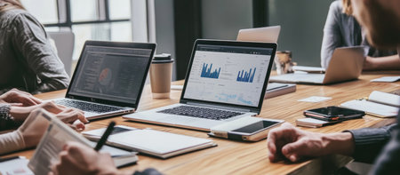 A business strategy meeting, with laptops displaying various digital marketing KPIs and metrics.. --ar 16:7 --v 6.1 Job ID: d9932d0a-7474-4674-923b-c6e166e5288a