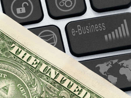 Internet business concept. Laptop button with the inscription and with the image of the growth graph. On top of the keyboard is a US banknote.