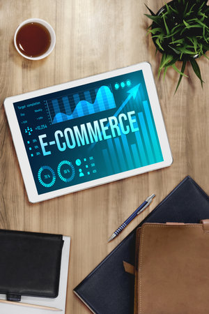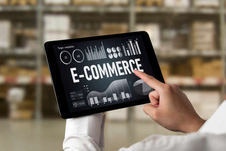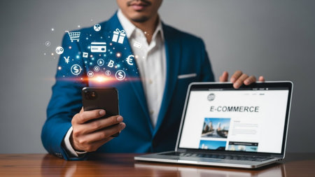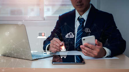 E-commerce and online shopping concept. Businessman using mobile phone and laptop computer with online shopping icons.