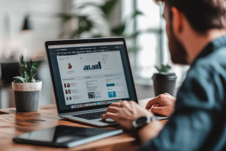 A person types intently on a laptop, browsing through various car models displayed on the screen. The sleek workspace features minimalist decor and ample natural light, inspiring creativity.