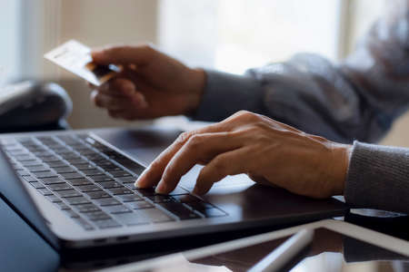Close up view of female hand holding debit card and online paying on laptop in office room