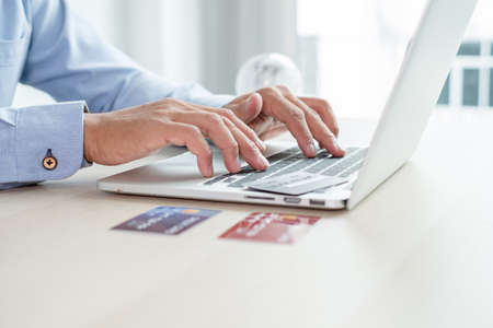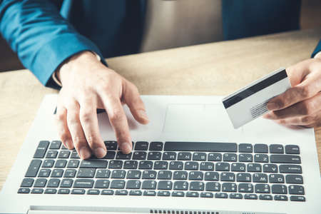 The businessman's hand is holding a credit card and using a laptop for online shopping and internet payment in the office.