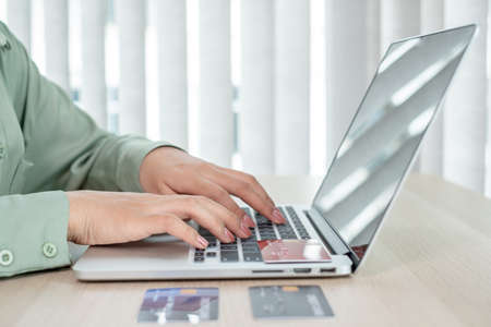 Woman hand typing on laptop computer keyboard and holding credit card for online shopping and internet banking. Online banking, e commerce, e business concept.
