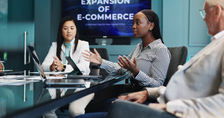 Business people, screen and talking in meeting for ecommerce apps, corporate pitch or information. Stakeholder, online expansion and women in discussion for digital banking and account management