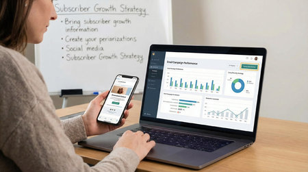 Digital marketer using email marketing tools on laptop and smartphone, sending newsletters and analyzing campaign performance to engage subscribers and grow business through personalized content