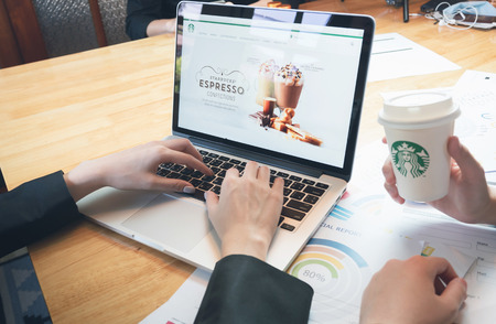 BANGKOK ,THAILAND - March 05, 2017 : Apple Macbook opening online page of Starbucks application, on the office room.