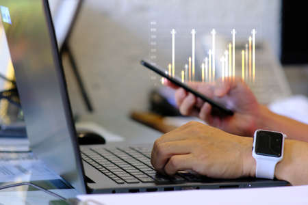 businessman hand working with mobile phone and laptop computer on desk in modern office with virtual graph chart diagram