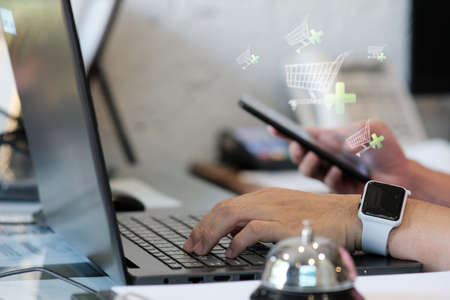 Hands of man are holding smart phones and using laptops computers are entering websites to buy products.
