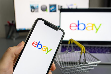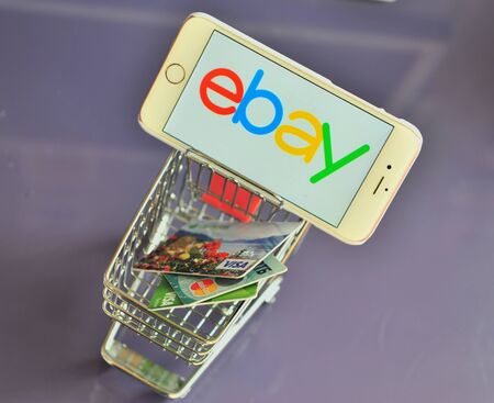 Yaroslavl, Russia - August 20, 2019: Smartphone with ebay logo in shopping cart with credit cards.