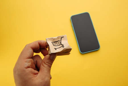 Smartphone with an image of a shopping cart on a turquoise background. Concept of autumn sales, Cyber Monday, Black Friday.