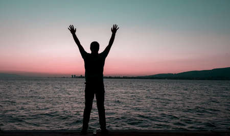 silhouette standing with both hands raised and sunset