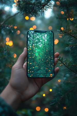 Hand holding a phone with digital holograms of trees, green bokeh background