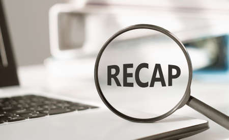 The inscription RECAP through magnifying glass on white table with laptop and office folders