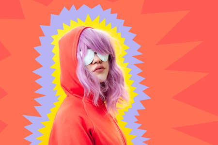 Art collage with alternative funky girl with pink hair on bright blue yellow pink background. Close up fashion portrait young beautiful woman in hoodie and white glasses. Unusual youth fashion concept
