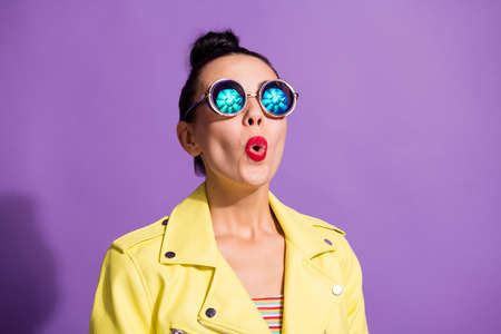 Photo of astonished crazy millennial girl look up empty space in vintage spectacles isolated over violet color background