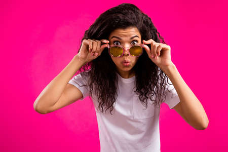 Photo of open-eyed wavy young lady touch spectacles wear white t-shirt isolated on pink color background