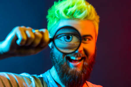 Portrait of happy young adult man in denim overalls holding magnifying glass and looking at camera with big zoom eye, joyful face and toothy smile. Colorful neon light, indoor studio shot.