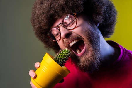 Crazy mad hipster man with Afro hairstyle holding flower pot with prickly cactus and trying to bite plant, wearing red sweatshirt. Indoor studio shot isolated on colorful neon light background.