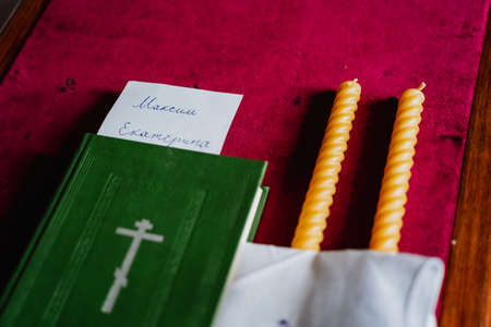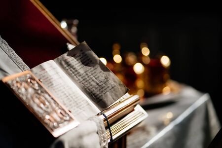 Church book the Bible is on the table in the temple, items for the wedding ceremony, candles, cross, close-up