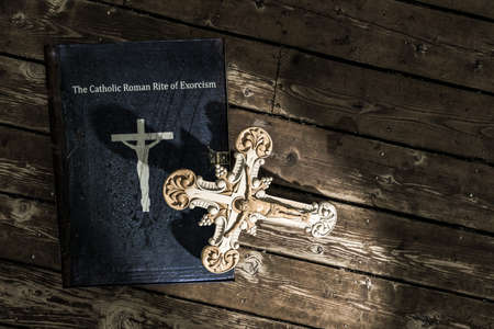 Closeup of simple wooden Christian cross necklace on Bible , vintage tone , god