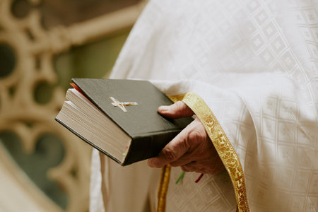 Closeup of hand of unrecognizable elderly Catholic priest holding prayer book standing outdoors