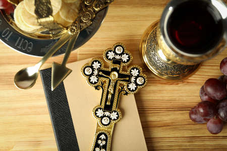 Man holding bread and wine in Hoy Communion or Eucharist. Holy bible on table at the background.