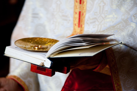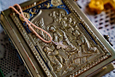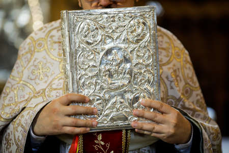 A priest holds a book for reading prayers during the rite of baptism in the Orthodox Church. Inscription on the book: the rite of baptism