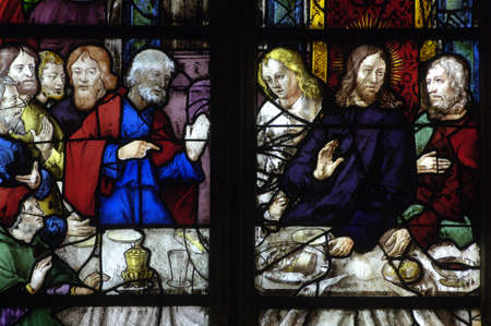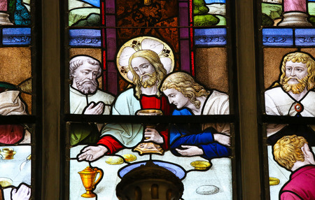 MECHELEN, BELGIUM - JANUARY 31, 2015: Stained Glass window depicting Jesus offering communion to His Apostles at the Last Supper, in the Cathedral of Saint Rumbold in Mechelen, Belgium.