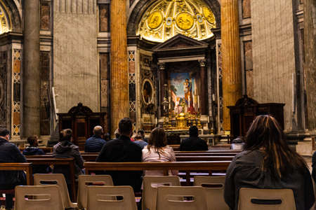 A young man in a coat in a close up Catholic church from the back. Bokeh effect with blur background. Free space on the right to insert text. Concept on the theme of faith, religion and church