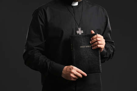Closeup of wrinkled hand of unrecognizable Catholic priest holding holy Bible book with rosary between pages