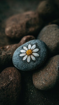 A close-up shot presents a daisy flower design artfully painted on a stone. The image displays a serene composition with varying shades of brown and gray stones. The naturalistic lighting enhances the details, potentially suitable for various commercial or decorative applications.
