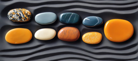 Artistic close-up of colorful smooth stones arranged together, with soft focus on the background, evoking calmness and natural beauty.