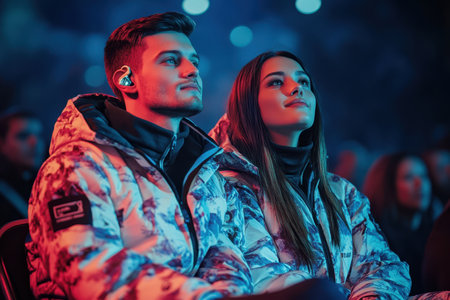 A couple watches a performance together at an evening event while dressed in vibrant winter jackets.