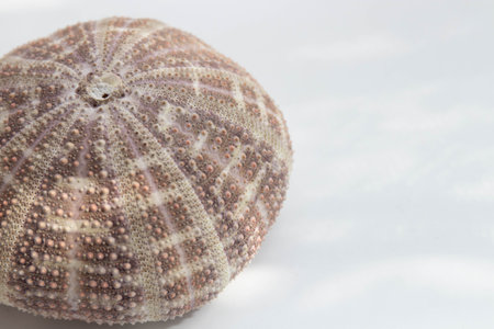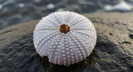 A close inspection reveals a sea urchin shell with intricate patterns and colors, resting on soft sand with the ocean waves gently lapping nearby, showingcasing nature's beauty.