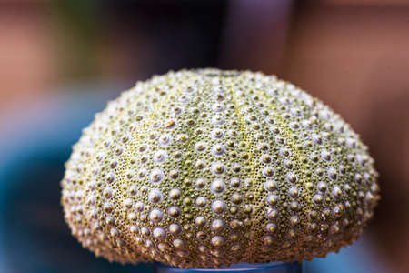 A close-up view reveals the unique texture of a spiky sea urchin shell, showing its rich patterns and colors, found along the ocean's edge during a sunny day.