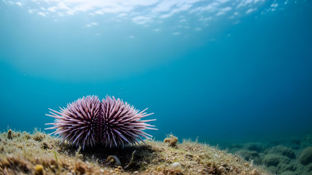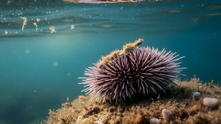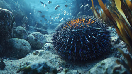 Sea urchin (Echinoidea). Sea urchins have a rounded body, reaching up to 30 cm in size Generative AI