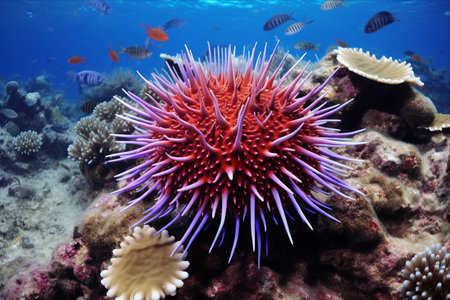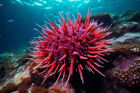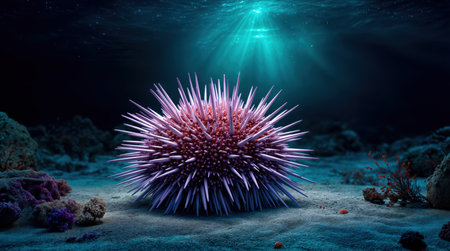A vibrant deep-sea urchin Echinus with spiny, colorful features resting on the ocean floor, surrounded by marine life and coral formations, showcasing its unique and striking appearance.