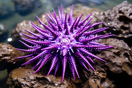 A spiny purple sea urchin rests on a textured rock underwater surrounded by clear blue water. The marine life image captures the detailed spines and natural habitat of the echinoderm.