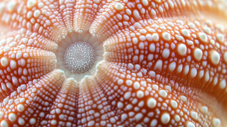 A highly detailed macro shot of a starfish's skin showing the intricate texture of bumps and spines in shades of orange and brown. The image highlights the natural geometric patterns and biological structures of marine life.