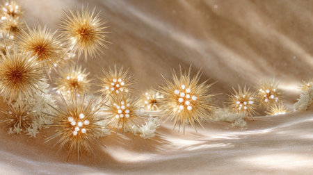 A mesmerizing arrangement of delicate golden dandelions set against a soft beige background captures the essence of nature's beauty and tranquility.
