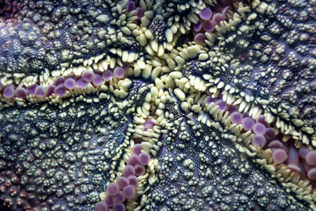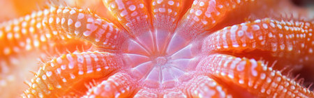 Exploration of a starfish's central disk reveals intricate patterns and vivid hues. The focus highlights the natural beauty of marine life, revealing the organism's unique structure.
