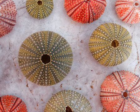 colorful sea urchins on white marble, natural pattern