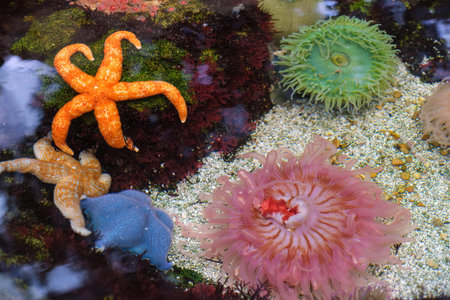 Sea anemone and starfish at low tide on a rocky beach